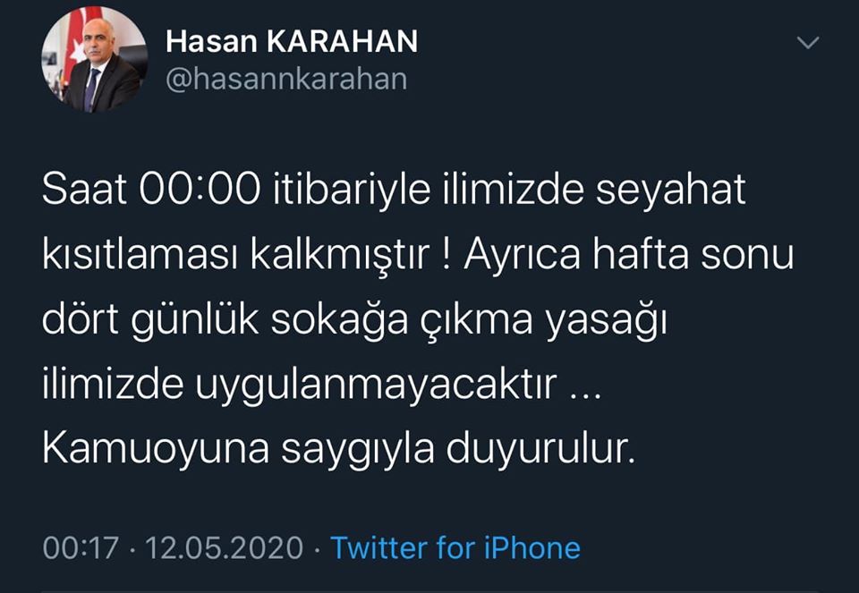 Denizli Valisi Hasan Karahan merak edilen sorunun yanıtını sosyal medya üzerinden verdi. 4 günlük sokağa çıkma yasağının Denizli’de uygulanmayacağını açıklayan Vali Karahan, “Saat 00:00 itibariyle ilimizde seyahat kısıtlaması kalkmıştır ! Ayrıca hafta sonu dört günlük sokağa çıkma yasağı ilimizde uygulanmayacaktır.Kamuoyuna saygıyla duyurulur” ifadelerine yer verdi.