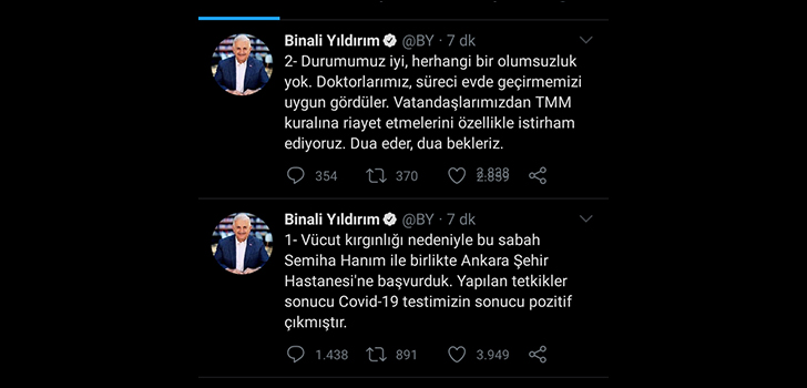Binalı Yıldırım, koronavirüs testinin pozitif çıktığını açıkladı.