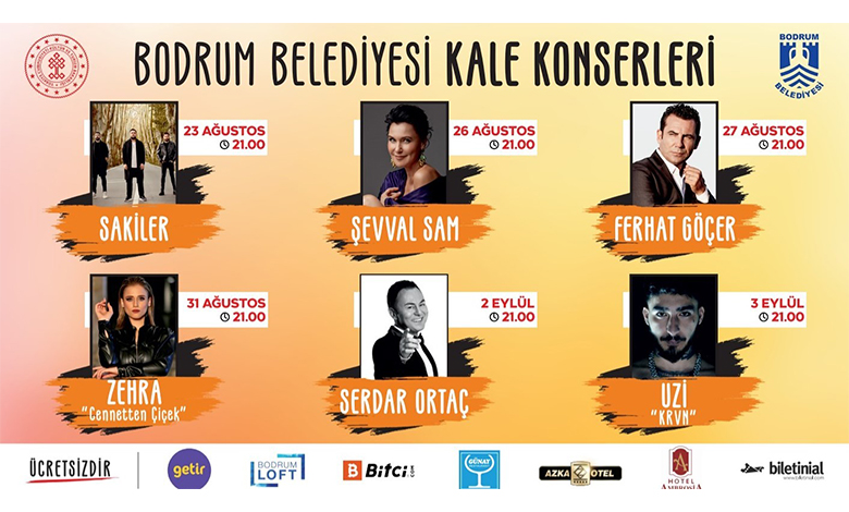 Bodrum’da yaşanan yangın felaketinin ardından normalleşmeye gidilmesiyle birlikte Bodrum Belediyesi halk konserleri düzenlemek için kolları sıvadı. Bodrum Kalesinde 23 Ağustos’ta Sakiler konseri ile başlayacak olan konserler 3 Eylül’de son bulacak. İlk konserde Sakiler Grubu sahne alırken, ardından 26 Ağustos Şevval Sam, 27 Ağustos Ferhat Göçer, 31 Ağustos Zehra, 2 Eylül Serdar Ortaç konserinin ardından 3 Eylül’de de son konserde Uzi Bodrumlularla buluşacak. Pandemi ve yangınların ardından halka moral konseri düzenleyen Belediye Başkanı Ahmet Aras konserlerin yanı sıra daha birçok etkinlik gerçekleştireceklerini açıkladı.