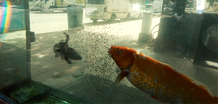 Dükkan dışında bulunan akvaryumda yaşayan koi balığını görenler akvaryumu bir süre izledikten sonra yollarına devam ediyor.