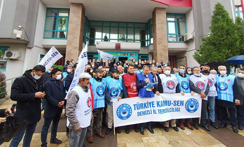Türkiye Kamu Sen İl Temsilcisi ve Türk Eğitim Sen Şube Başkanı Emre Erdoğan, sendika üyeleriyle birlikte Denizli Vergi Dairesi Başkanlığı önünde basın açıklaması yaptı. Erdoğan, son dönemde yaşanan ekonomik gelişmelerin, memur ve emeklileri ekonomik sıkıntıya düşürdüğünü ifade ederek, “Geçen sene bu günlerde 1 dolar 7,90 TL idi bugün 14,3 lira; artış %81. Geçen sene bugünlerde çeyrek altın 724 lira idi bugün 1320 lira; artış %82. Geçen sene bugünlerde 4 kişilik ailenin aylık zorunlu harcaması 7.770 lira idi bugün 9642 lira; artış %24. Bir sene içinde ortalama memur maaşı 567 dolardan 365 dolara geriledi. Erime %35,6. Geçen sene memur maaşıyla 6,2 çeyrek altın alınabilirken bugün ancak 3,9 çeyrek altın alınabiliyor. Erime %37. Enflasyon resmi rakamlara göre bile %21,31 ama memur maaşına yapılan zam enflasyon farkı da dahil %16,4. Erime %4,91. Neresinden tutsak elimizde kalıyor; neresinden baksak maaşlar kuşa dönmüş durumda. Son 10 yıldır memur maaşları enflasyonun bile altında kalıyor ve sürekli eriyor. Bu durum küresel salgınla birlikte sürdürülemez bir hal aldı. Memurlarımız ve emeklilerimiz, yoksulluk sınırının altında, en temel ihtiyaçlarını bile karşılayamaz durumdadır. Toplu sözleşme görüşmeleri de etkisiz sendikalar ve malum konfederasyon yüzünden yaralara çare üretmekten uzak kalmaktadır. Daha 3 ay öce, önümüzdeki yıl için %5+7 gibi komik bir rakama davul zurnayla imza atanlar, bugün yüzleri bile kızarmadan toplu sözleşmenin yenilenmesinden söz ediyor” dedi.