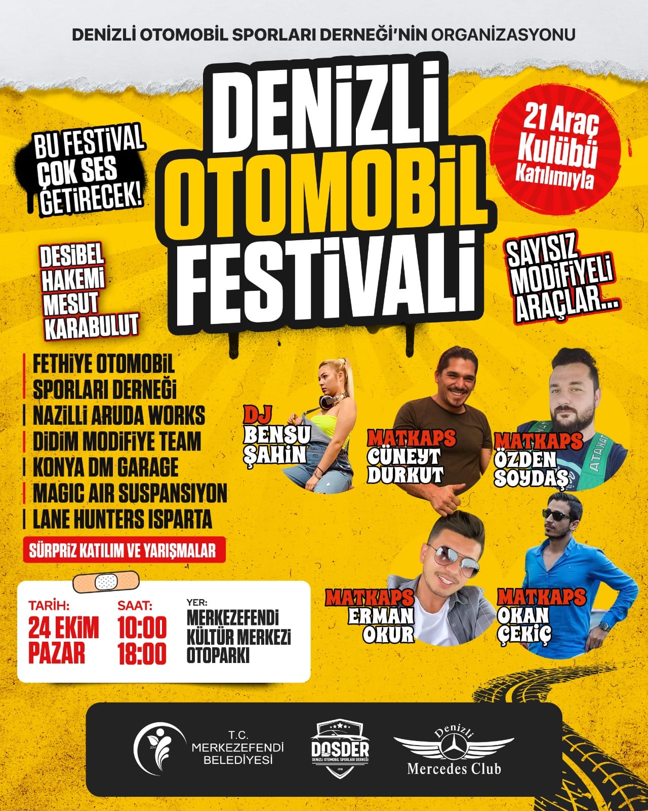 Denizli’de otomobil festivali heyecanına geri sayım başladı. Denizli Otomobil Sporları Derneği, 24 Ekim Pazar günü muhteşem bir otomobil festivaline imza atacak. Tüm hazırlıkların sürdüğü festival, çok konuşulacak. Merkezefendi Kültür Merkezi otoparkında düzenlenecek olan festivale Türkiye’nin 4 bir yanından 34 araç kulübü katılacak. Sayısız modifiyeli araç, otomobil tutkunları için festivaldeki yerini alacak. Festivale, DJ Bensu Şahin, Matkaps Cüneyt Durkut, Özden Soydaş, Erman Okur, Okan Çekiç gibi ünlü isimler de katılacak. Desibel hakemi ise Mesut Karabulut olacak. Festival, 24 Ekim Pazar 10:00’da başlayacak ve 18:00’de sona erecek.