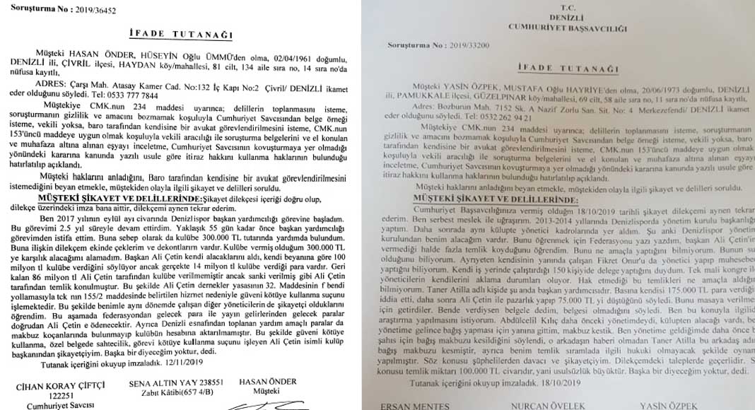 Denizlispor’un eski yöneticileri Yasin Özpek ve Hasan Önder, Cumhuriyet Başsavcılığı’na suç duyurusunda bulundu.