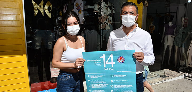 Neredeyse gün boyunca Lise Caddesi’ndeki esnafları tek tek dolaşan DTO Başkanı Erdoğan, 120 civarında işyerinin tek tek kapılarını çalarak işverenler ve çalışanlarla hasbihal etti; Covid-19’la mücadeleden ödün vermemeleri ve kurallara harfiyen riayet etmeleri uyarısında bulundu.