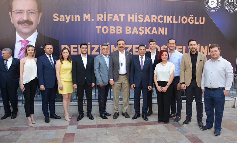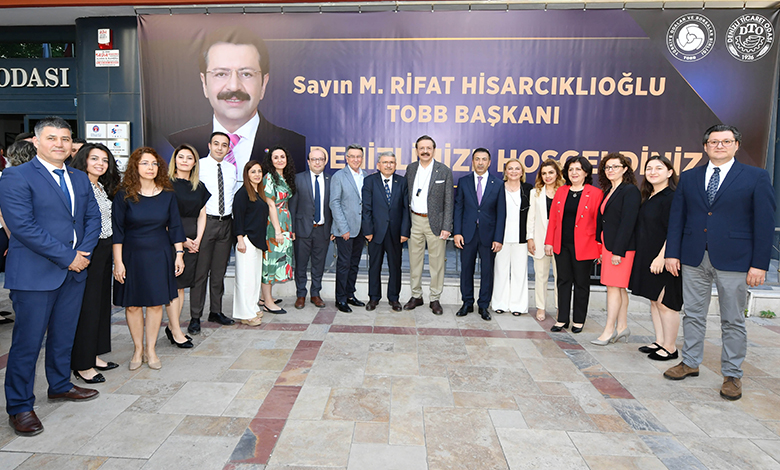 TOBB Başkanı M. Rifat Hisarcıklıoğlu, Denizli Ticaret Odası’nı ziyaret etti. Hisarcıklıoğlu’nu, odanın Bayramyeri’ndeki hizmet binasının girişinde, DTO Başkanı Uğur Erdoğan ve DTO Meclis Başkanı Salih Sarıkaya ile büyük bir kalabalık, ellerinde çiçeklerle karşıladı.