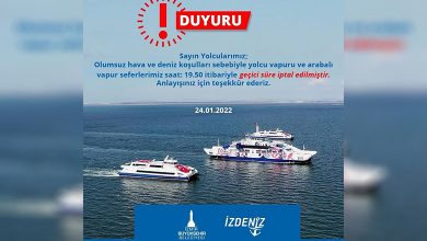 İZDENİZ tarafından yapılan açıklamada, yolcu vapuru ve arabalı vapur seferlerinin 19.50 itibariyle iptal edildiği bildirildi. Açıklamada, “Olumsuz hava ve deniz…