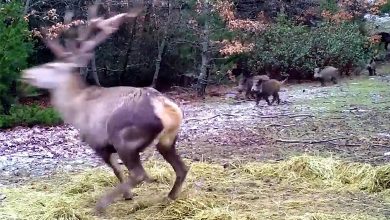 Denizli’de halen karla kaplı Karcı Dağı’na bırakılan yemlerle karnını doyuran kızıl geyik, aç kalan domuz sürüsünün tacizi sonucu yemeğini yarıda…