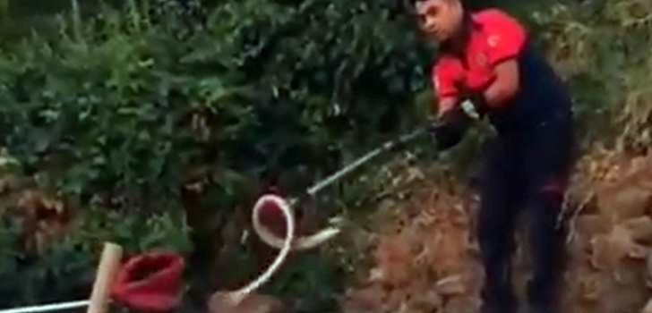 Denizli’de bir evin bahçesine giren yılan paniğe sebep oldu. Yılanı gören ev sahipleri yardım istemesi üzerine itfaiye ekipleri özel aparat yardımıyla yakaladığı yılanı doğal yaşam alanına bıraktı.