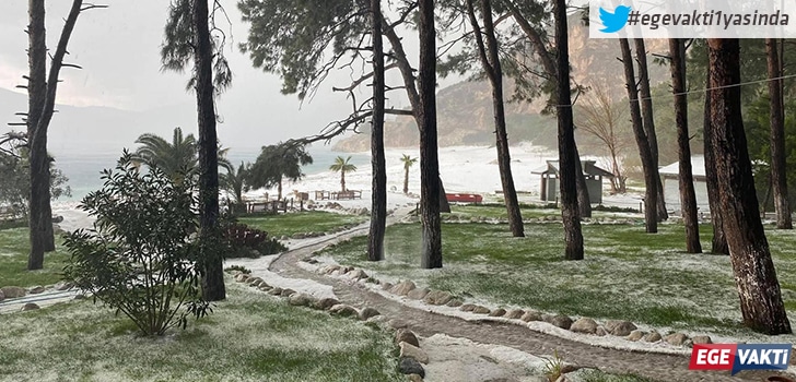 Muğla’nın Fethiye ilçesinde etkili olan dolu yağışı nedeniyle beyaza bürünen sahilde kartpostallık görüntüler oluştu.