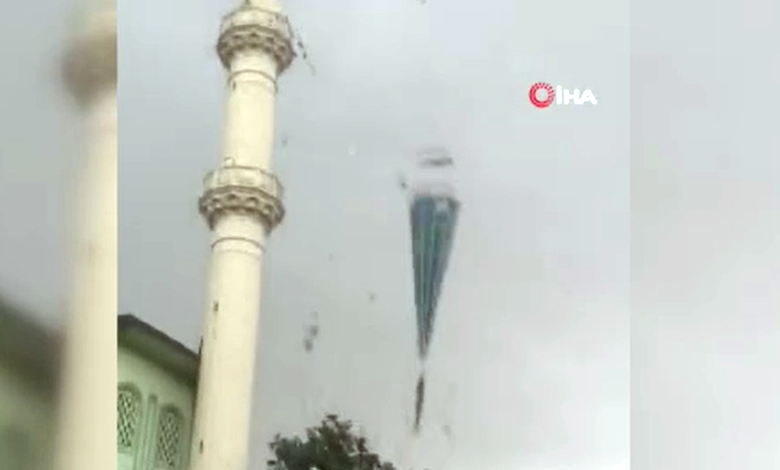 Minarenin yıkılması esnasında yaşanan panik, fırtınayı görüntülemek isteyen bir şahsın kamerasına saniye saniye yansıdı.