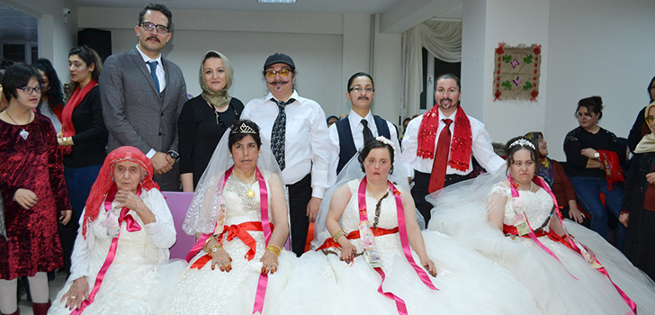 Denizli’de düzenlenen temsili düğünde down sendromlu Esma Yüksel (31) ve Vildan Karnak (33), zihinsel engelli Sema Avcı (51) ile işitme engelli olan 88 yaşındaki Emine Kurşuncu gelinlik giydi. Etkinlikte görevli 3 kadın, erkek takım elbisesi giyerek makyaj yaparak ‘temsili damat’ oldu. Düğün öncesi yakınları ve aileleri ile birlikte şehir turu atan gelinler, alkış ve müzik eşliğinde salona girdiler.