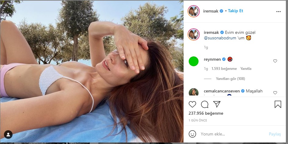 Tatilini Bodrum’da sürdüren güzel oyuncu İrem Sak, sosyal medya hesabını da aktif kullanıyor. İrem Sak, sosyal medyadan bikinili bir pozunu paylaştı. Fotoğrafa çok sayıda beğeni ve yorum geldi.