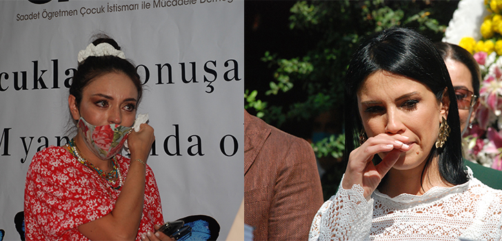 İzmir’de Saadet Öğretmen Çocuk İstismarı ile Mücadele Derneği (UCİM) tarafından açılışı yapılan Türkiye ve Avrupa’da ilk ‘İhmal ve İstismarı Önleme Merkezi’nin töreninde, dernek başkanı ve öğretmen Saadet Özkan, ünlü oyuncu Ezgi Mola ve davetliler gözyaşlarını tutamadı.