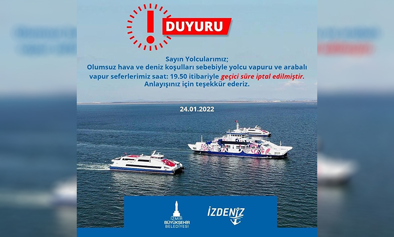 İZDENİZ tarafından yapılan açıklamada, yolcu vapuru ve arabalı vapur seferlerinin 19.50 itibariyle iptal edildiği bildirildi. Açıklamada, “Olumsuz hava ve deniz koşulları sebebiyle yolcu vapuru ve arabalı vapuru seferlerimiz saat 19.50 itibariyle geçici süre iptal edilmiştir. Anlayışınız için teşekkür ederiz” ifadelerine yer verildi.