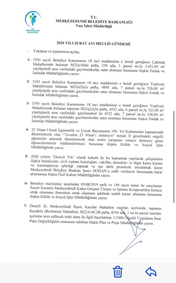Merkezefendi Belediye Meclisi’nin 2020 yılı Şubat ayı Meclis Gündemi yayınlandı. Belediye Başkanı Şeniz Doğan’ın imzasını taşıyan ve mecliste görüşülecek olan maddeler listesinde bir madde var ki, gündeme bomba gibi düştü. Adalet Mahallesi’nde 5 kat ruhsatlı konutların olduğu bölgedeki bir parselin, talep üzerine Şeniz Doğan’ın meclis gündemine almasıyla, imar planında turizm alanına çevrilmesi ve 10 kata çıkarılması görüşülecek. Eğer imar planı değişikliği meclisten geçerse, şuanda yaklaşık değeri 15 Milyon TL olan arsanın değeri, bir anda 30 Milyon TL’ye çıkacak.