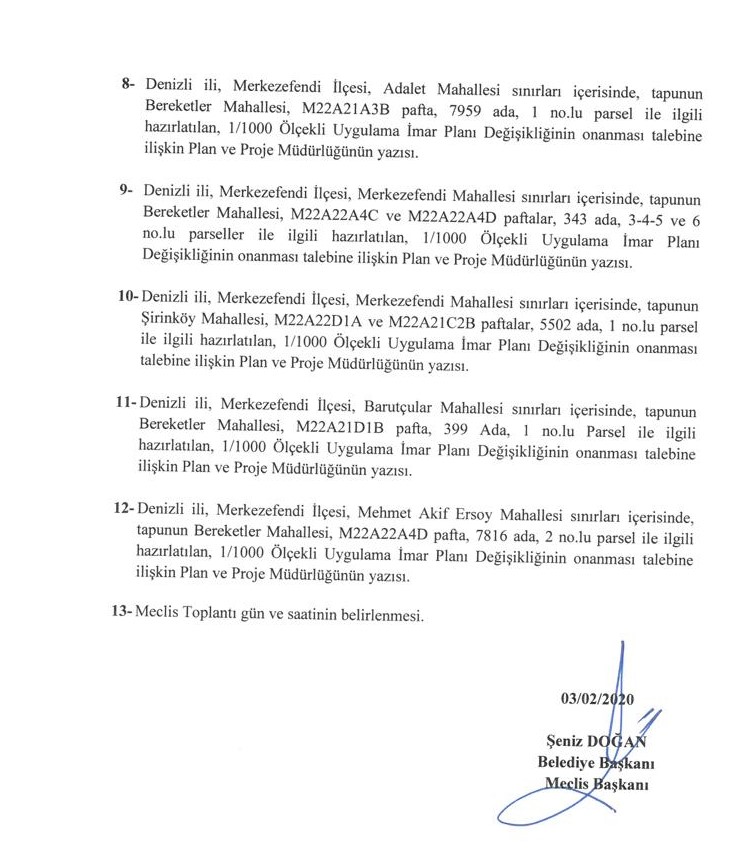 Merkezefendi Belediye Meclisi’nin 2020 yılı Şubat ayı Meclis Gündemi’nin yayınlanması ile birlikte Adalet Mahallesi’nde talep edilen kişiye özel imar değişikliği maddesi gündeme bomba gibi düştü. 2 yıl önce Denizli Büyükşehir Belediyesi’nden 15 Milyon TL fiyatla Konut Alanı ve 5 Kat ruhsatlı olarak 9 bin 778 m2 büyüklüğündeki parseli satın alan Çetin İnşaat Malzemeleri Sanayi ve Ticaret Limited Şirketi, bu kez Merkezefendi Belediyesi’ne müracaat ederek satın aldığı parselin imar planında turizm alanına çevrilmesini ve 5 kat inşaat yapma hakkının da 10 kata çıkarılmasını talep etti. Söz konusu talebin Merkezefendi Belediye Başkanı Şeniz Doğan’ın imzası ile Meclis gündemine alınması bomba etkisi yarattı.