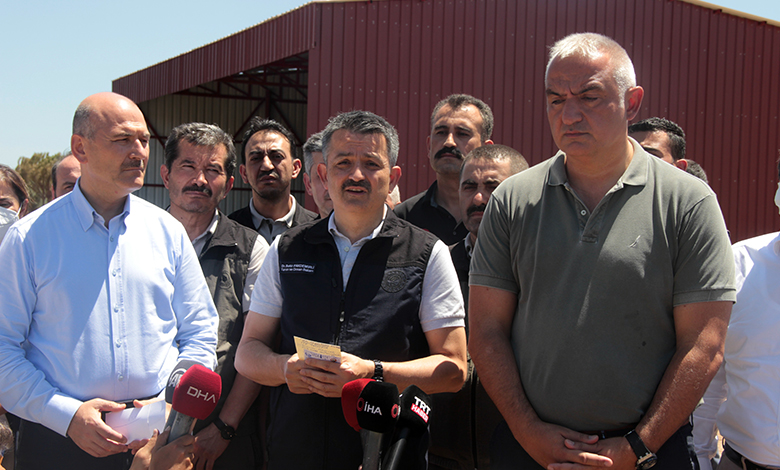 İçişleri Bakanı Süleyman Soylu ise, “Sahayı hem karadan ve havadan bir iki defa değerlendirdik. Sabah itibari ile tekrar yangını değerlendirdik. Burada son durumu değerlendirdik. Devletin bütün kurumları tüm yangınların söndürülebilmesi için büyük çaba sarf ediyorlar. Biz pandemi geçirdik, tüm sağlık çalışanlarımıza moral verdik. Şimdi de buranın önde gelen kahramanları ormancılarımız. Ateşin üzerine giden insanlarımız bunlar. Lütfen biraz empati yapalım. Bir milletvekilin paylaşımını gördüm, üzüldüm. ‘Geldim bir tane ormancı göremedim’ demiş. Göremezsin tabi hepsi ormanda ve alevlerin içinde savaşıyorlar. Dün 13 tane ormancı yangının içerisinden alındı. Bu kadar acımasız eleştirilerin yapıldığı buradan rant elde ederim düşüncesi sapkın bir düşüncedir. Bu yangını söndürecek olan ormancılardır. Bu işin profesyoneli onlardır. İki tane selfie çekmekle yangın söndürülmüyor. Buradan herkese siyasi parti gözetmeksizin söylüyorum. Ormancılarımızın morallerini yükseltmek, vatandaşlık görevimizdir. Ana muhalefet partisinden bir istirhamımız var. Antalya ve Manavgat belediye başkanlarımızla beraber çalışıyoruz. Bu belediyelerin eksikliğini söylemek sorumsuzluktur. Bu ormanları turizm için yakıldığını söylersiniz. Bunu söylerseniz belediyelere biraz ağırdan alırsınız dersiniz. Bunu yaparsanız ayrım yaparsınız. Bir öfke oluşturabilir miyim derseniz yanlış olur. Buradan söylüyorum. Sosyal medyanın yüzde 90’ı yanlıştır. İşi olanlar yangını söndürmek için uğraşıyor. İşi olmayanlar dedikodu yapıyor. Lütfen ormanlık bölgelerde gezip selfie çekmeyin. Lütfen yerel yönetimlerle, belediyelerle arımıza nifak sokmayın. Her yer kuru, nem az. Rüzgar dezavantajımıza. Bu mücadelemizi sürdürürken devletimizi zora sokmayalım. Zaten sosyal medyadan endişe oluşturmak için çalışıyorlar. Yüzlerce hesabı tespit ettik. Bunlarla ilgili çalışmalar devam ediyor. Muğla ile ilgili olarak büyük bir mücadele ortaya koyuluyor. Yerel yönetimlerimizi ormancılarımızı herkesi tebrik ediyorum. Yerleşim yerlerine girmeden yangınlar durdurulmuştur. Bunu aynı performansla bunu sürdürmeliyiz. 8 yerleşim yeri boşaltılmıştır. 5 yerleşim yeri kısmen boşaltılmıştır. Toplam 13 yerleşim yeri boşaltılmıştır. 70’in üzerinde konut kullanılmaz hale gelmiştir. Tespitler devam etmektedir. Bu işler tamamlanıncaya kadar, yaşamayı temin eden imkanlar sağlanıncaya kadar biz desteğimizi sağlıyoruz. Sosyal medyayla ilgili bir kamplaşma oluşturmak istiyorlar. Bu nefret dilinden uzak duralım. Bunun bize ve ülkemize herhangi bir faydası yok. Siyasetçiler siyasetlerini yangınlarda yapmasınlar. Biz öğleden sonra neye ihtiyacımız olduğunu AFAD aracılığı ile bildireceğiz” diye konuştu.