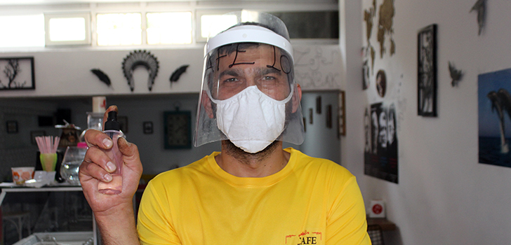 Maske takmayarak, “Korona neredeyse gelsin beni bulsun” sözleriyle gündeme gelen Üzeyir Yazır artan virüs tehlikesini görünce şimdilerde maske, siperlik ve dezenfektan ile dolaşmaya başladı.