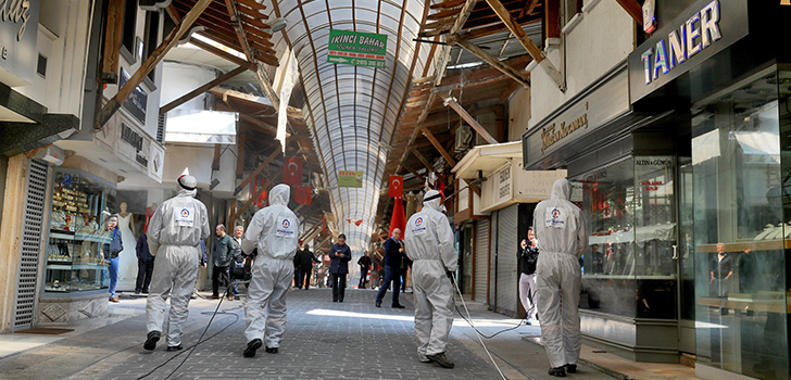 Türkiye’de artan korona virüs vakalarına tedbirlerde artarak devam ediyor. Dünyada 50 bin insanın hayatını kaybetmesine neden olan salgına karşı Denizli Büyükşehir Belediyesi Çevre Koruma ve Kontrol Dairesi’ne bağlı ekipleri meydanlarda dahil her alanda üst düzey önlemleri alıyor. 800 yılı aşkın süredir kentin alışveriş denilince ilk akla gelen yerlerden olan tarihi Kaleiçi Çarşısı’nı sabunlun suyla yıkayarak dezenfekte etti. Çarşı içerisinde yer alan 650 işyeri de Sağlık Bakanlığı Halk Sağlığı Genel Müdürlüğü tarafından ruhsatlı biyosidal ürünler ile özel ekipler tarafından dezenfekte edildi. Esnaf ve vatandaşların büyük bir memnuniyet ile karşıladığı çalışmayı gerçekleştiren Büyükşehir Belediyesi ekipleri, tarihi çarşı içerisinde bulunan oturma ve dinlenme alanlarında da dezenfekte işlemi yaptı. Denizli Büyükşehir Belediye Başkanı Osman Zolan, tarihi Kaleiçi Çarşımızı ve içerisinde yer alan 650 esnafımızın işyerini de dezenfekte ettik” dedi.