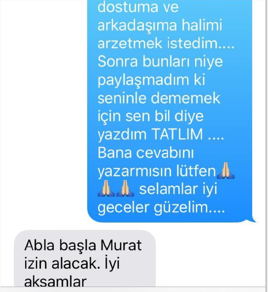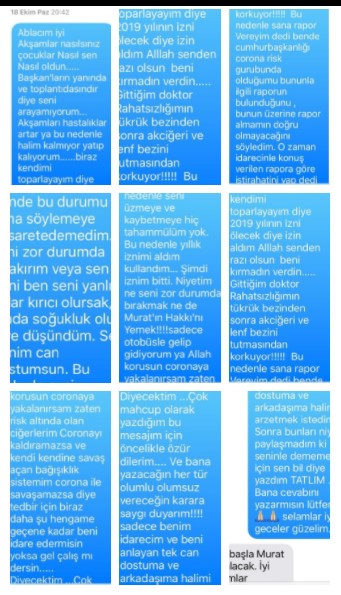 Üstlerine mesajlar atan ve adeta yalvarırcasına ve nazik bir dile “İzninin bittiğini. Ama elinde raporu bulunduğunu. Otobüsle gidip geldiğini ve korona yakalanması durumunda da, ciğerlerinin bunu kaldırmayacağını, doktorunun söylediğini ve yardımcı olunmasını” iletmesine rağmen, karşıdan gelen cevap : ‘Abla başla. Murat izin alacak. İyi akşamlar’ oldu…
