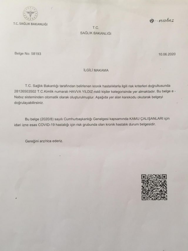 10.06.2020 tarih ve 58193 sayılı belgeye bakıldığında, Havva Acarol’un, Fatma Yıldız (o dönem ki evlilik soyadı)adıyla düzenlenen raporda, ‘idari izine tabi riskli kişiler kategorisinde’ olduğu açıkça belirtiliyor ve Cumhurbaşkanlığı Genelgesi’ne dayanılarak da, gereğinin yapılması talep ediliyor.