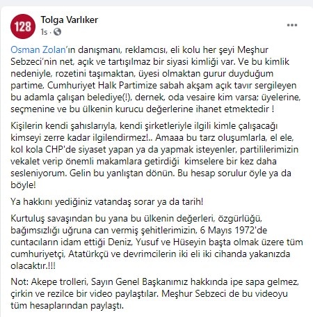 CHP Merkezefendi Eski İlçe Başkanı Tolga Varlıker, sosyal medyadan şok bir paylaşım yaptı.