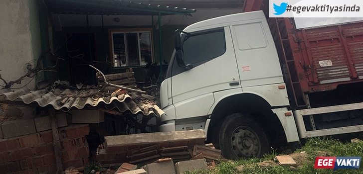 Denizli’nin Çivril ilçesinde meydana gelen kazada, yoldan çıkan kamyon eve çarparak durabildi.
